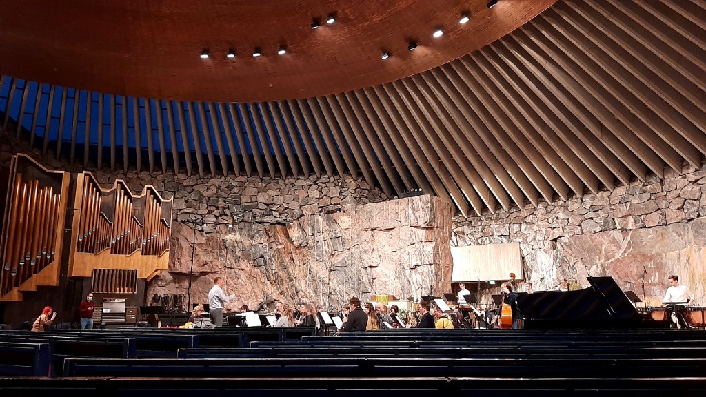 La Temppeliaukio Kirkko è una struttura davvero caratteristica e con un’acustica fenomenale: noi ci siamo trovati a passare da queste parti mentre un’orchestra stava effettuando le prove per un concerto e, una volta pagato il biglietto d’ingresso (4€ a persona), ci siamo potuti accomodare e godere della vista dell’ambiente circolare interno, così inusuale e molto arioso a dispetto del materiale in cui è intagliato il perimetro, con uno splendido sottofondo musicale.