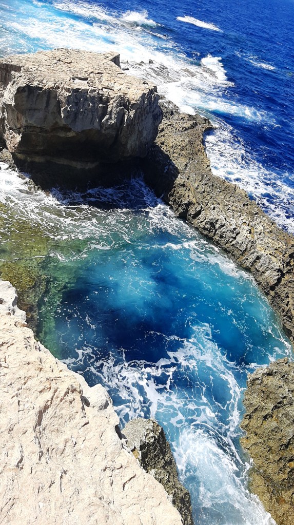 Sul versante occidentale di Gozo sorge quello che è forse uno dei punti più fotografati dell’isola: il Blue Hole, un punto spettacolare della costa dove, guardando verso il basso, è possibile scorgere un cerchio quasi perfetto tra le rocce calcaree dove l’acqua profonda fino a 35 metri raggiunge un blu intensissimo. Un vero e proprio paradiso per le immersioni, a giudicare da alcune foto subacquee che mi è capitato di vedere, ma anche dall’esterno un colpo d’occhio a dir poco incredibile, a due passi da un’altra meraviglia della natura ormai, sfortunatamente, perduta: la Azure Window, quella che sembrava una “finestra” nella scogliera che attirava visitatori e fotografi ogni anno, finché nel 2017 non è crollata a causa di una tempesta.