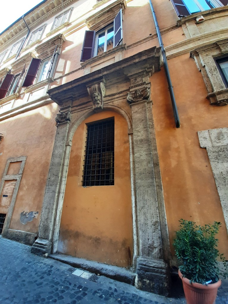 Appena imboccata via della Reginella da Piazza Mattei, si nota poi sulla destra la sagoma di un imponente portone murato: in questo caso parliamo dell’originale ingresso di Palazzo Costaguti, ingresso spostato proprio su Piazza Mattei (dov’è tuttora) al momento dell’istituzione del ghetto ebraico a metà del Cinquecento, per evitare alla nobile famiglia che anche il proprio palazzo fosse soggetto alle restrizioni della zona come ad esempio il coprifuoco serale.